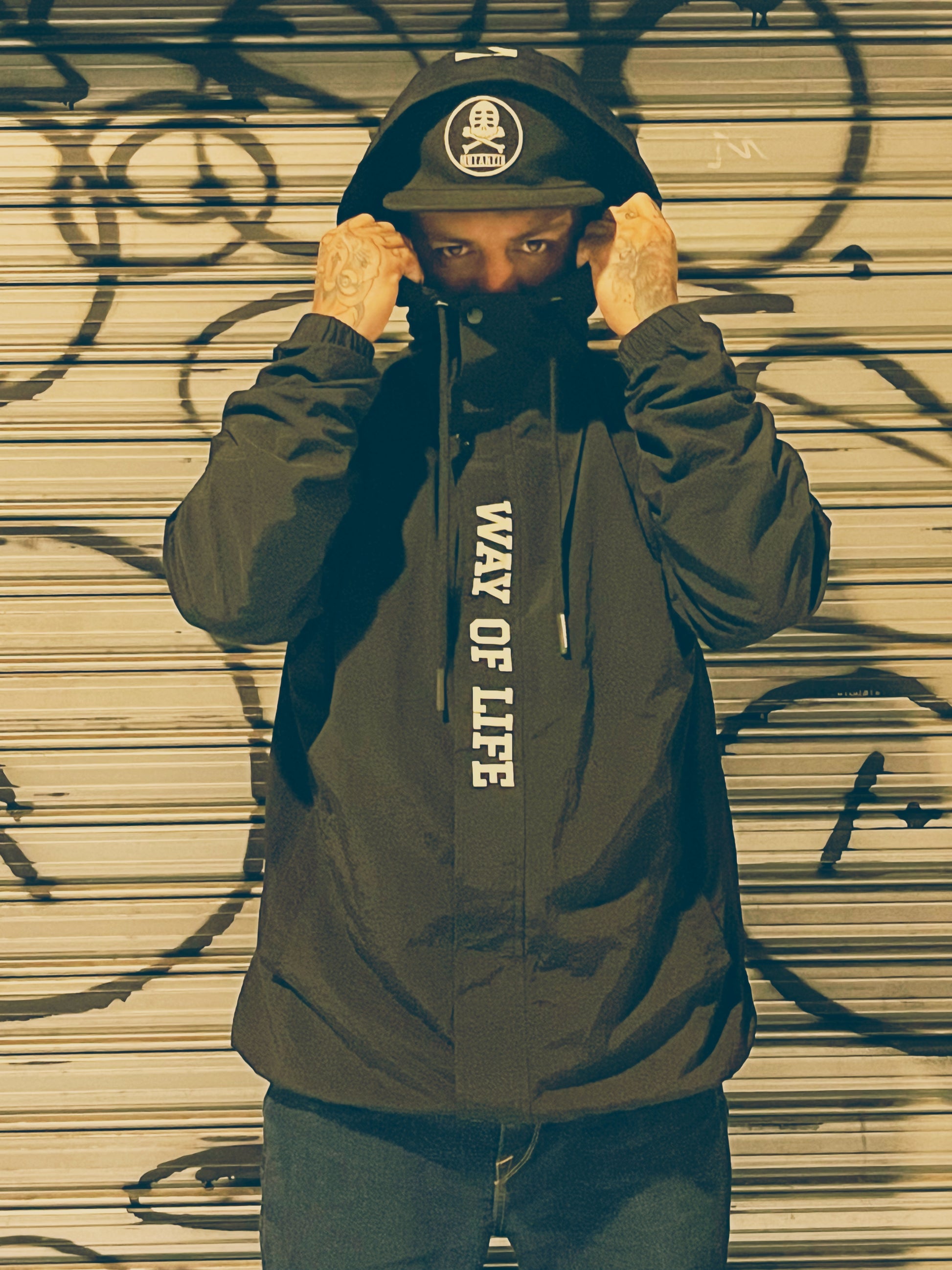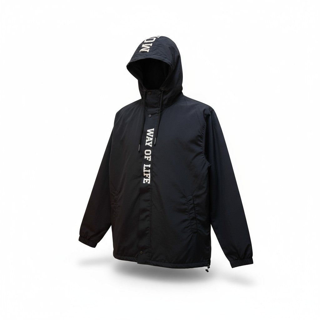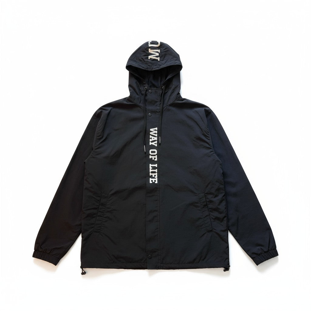 Su diseño incluye capucha ajustable, cierre frontal completo y estampado vertical “WAY OF LIFE”, detalles que lo convierten en un cortaviento ideal para días frescos y ventosos, sin perder el estilo.
